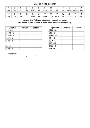Decimal Division - Sheet 1. Division worksheets for grades 3-6. For each numeric answer there is a letter assigned shown in a key.