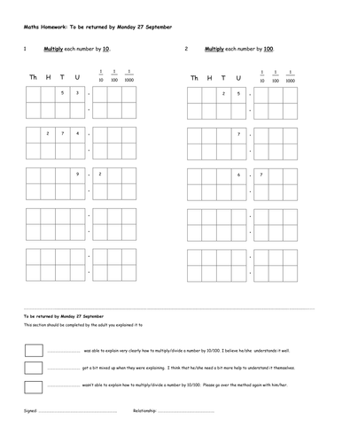 The worksheets start with multiplying and dividing single-digit numbers by 10 and 100. Dividing with Multiples of 10s. Pupils should be encouraged to use place value grids and counters to help them understand what happens.
